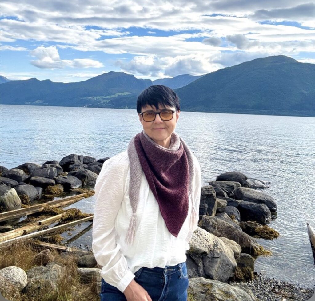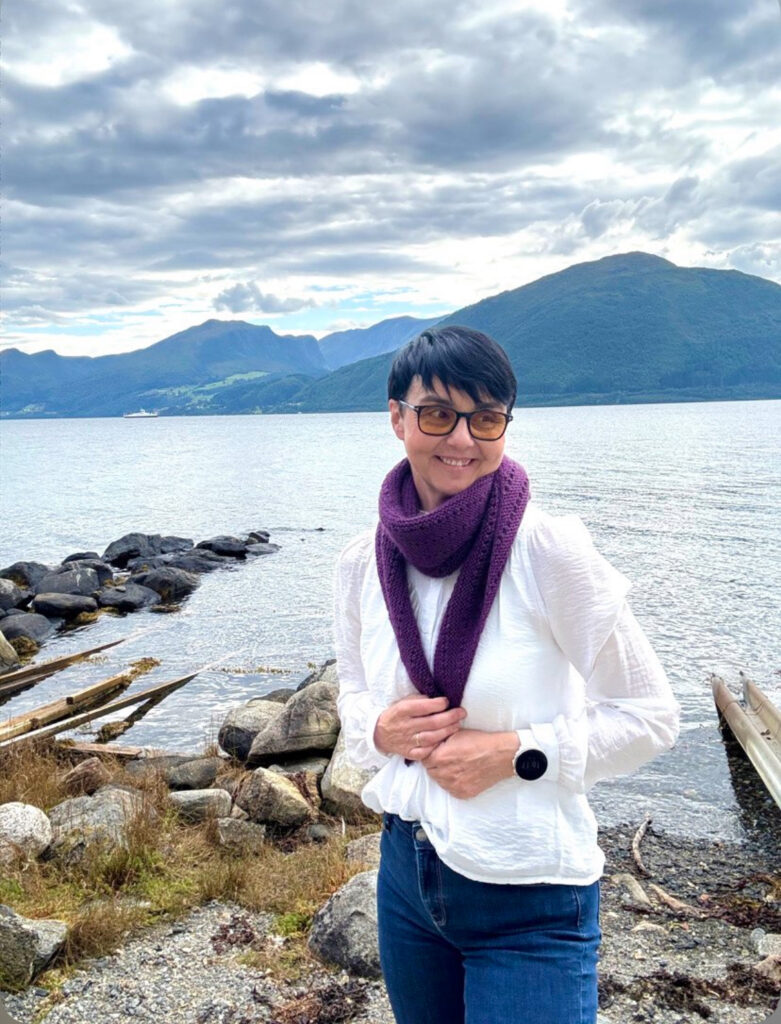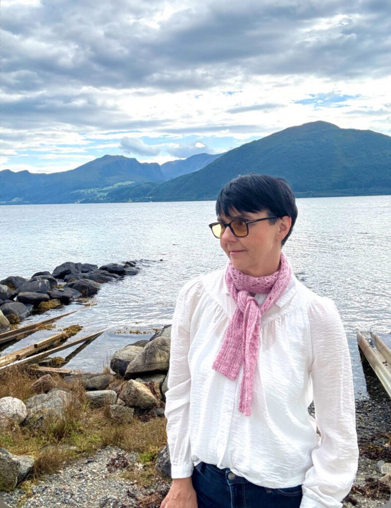Skjerf strikket av double sunday og Tilia frå Filcolana, lengde 135 cm, bredde 22 cm.