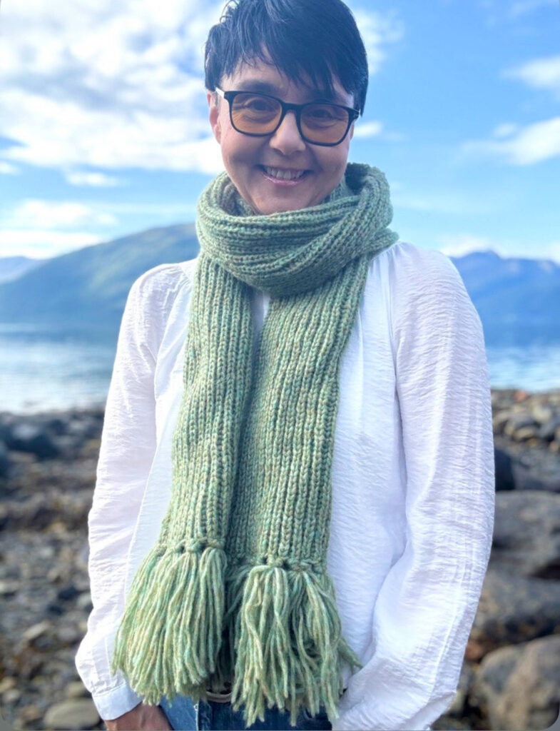Skjerf strikket med garnet lunt fargespill fra MH garn. Farge kløvereng. Lengde 150 cm, medberegna dusk på 10 cm. Bredde 60 cm. Pris 640 kr.